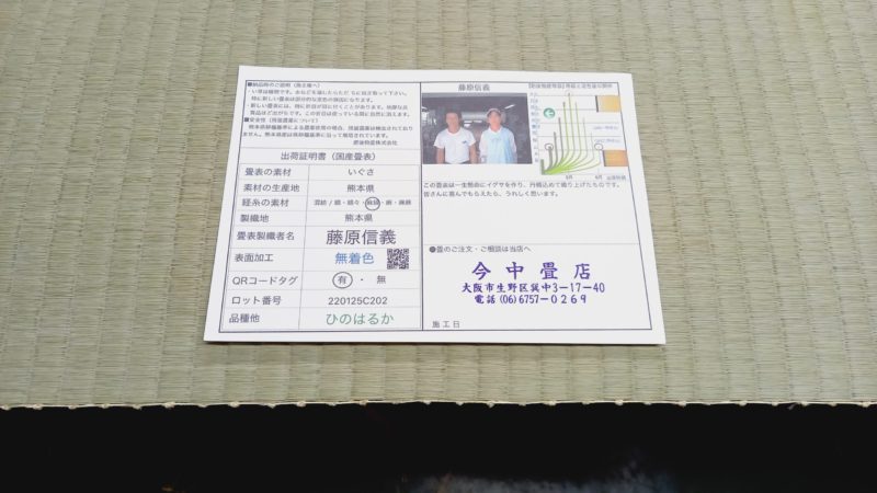 | 使用した畳表 | い草のこだわり品畳表(生産者熊本県い草農家藤原信義さん) 江戸間サイズ 経糸が麻綿 品種「ひのはるか」 写真2枚目 |