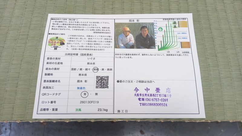 | 使用した畳表 | いぐさの当店一番人気畳表(生産者熊本県い草農家葭本彰さん) 関西間サイズ 経糸麻綿 品種涼風 写真2枚目 |